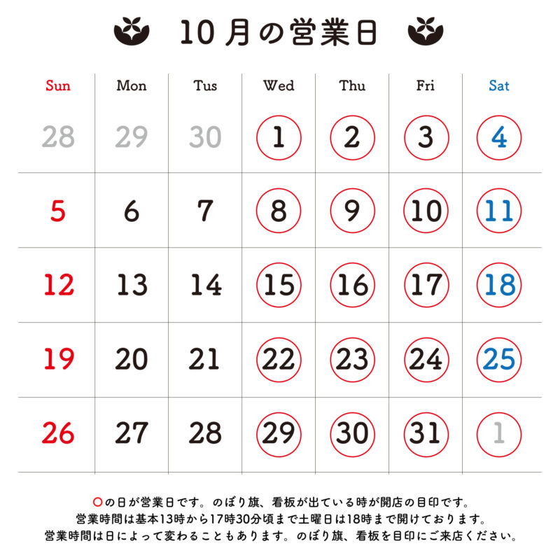 2025.10.02お知らせ 2025年10月 営業日のお知らせ 2025年10月の営業日のお知らせです。 営業日の変更に関する情報は、随時Instagramおよび公式サイトにてお知らせいたします。ご了承の程、よろしくお願い申し上げます。 お知らせ 一覧へ