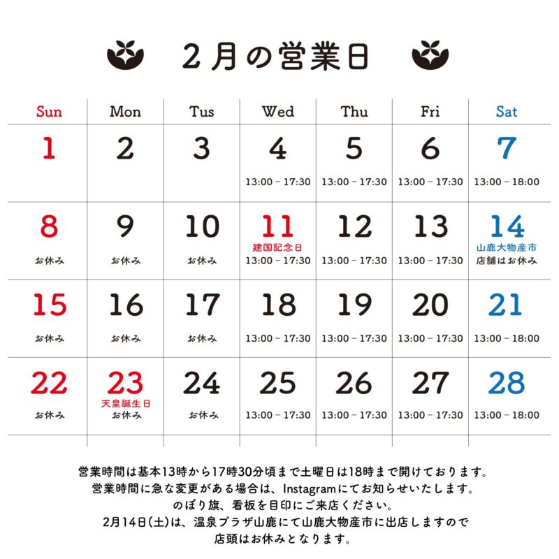 2026年2月14日…山鹿大物産市への出店の為、店舗は休業致します。